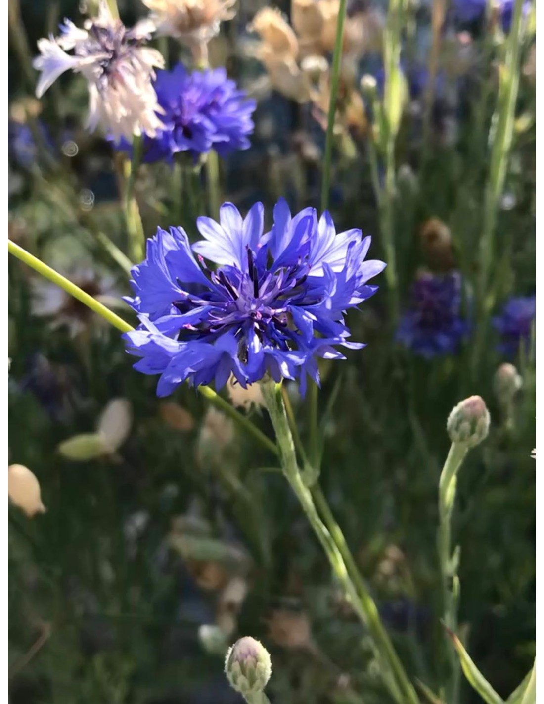 Descripción: Planta herbácea anual erguida con tallos finos y ramificados. Crece entre 30 y 90 cm dependiendo del suelo y las condiciones de cultivo. Sus hojas son alargadas y estrechas de un tono verde grisáceo y sus flores de color azul intenso, las cuales florecen desde finales de primavera hasta mediados del verano (mayo a julio en climas templados). Estas tienen un sabor suave, ligeramente especiado y algo amargo parecido al clavo. La centaurea cyanus es originaria de Europa, especialmente de las regiones mediterráneas y centroeuropeas. Tradicionalmente crecía de forma silvestre en campos de cereales y praderas, aunque hoy en día está naturalizada en muchas otras partes del mundo, como Norteamérica y Asia, debido a su uso ornamental y a la dispersión de semillas en cultivos.